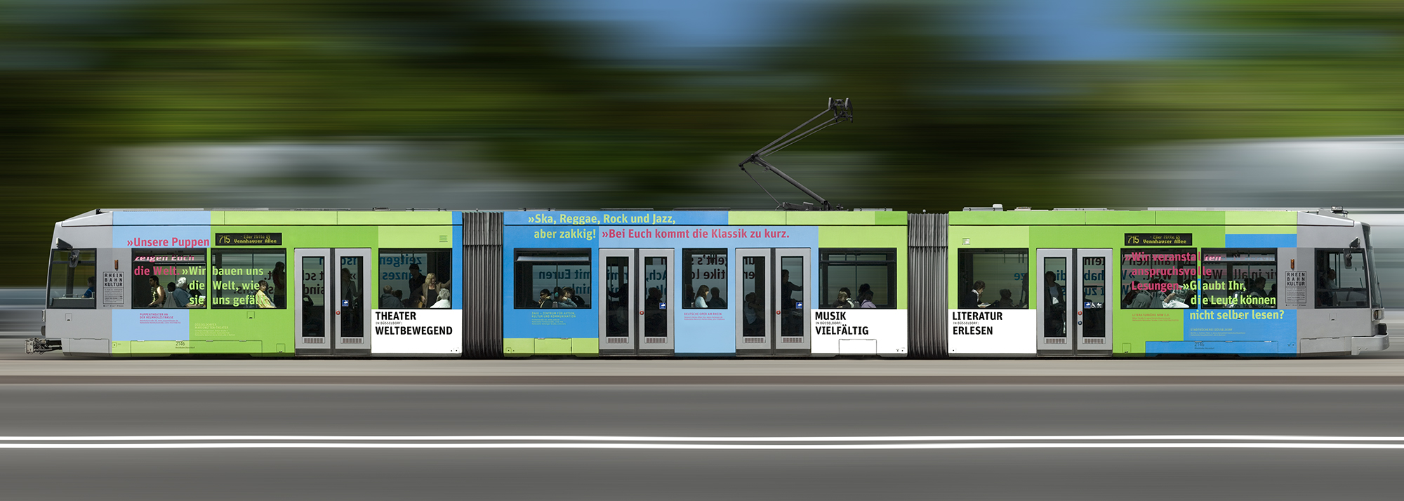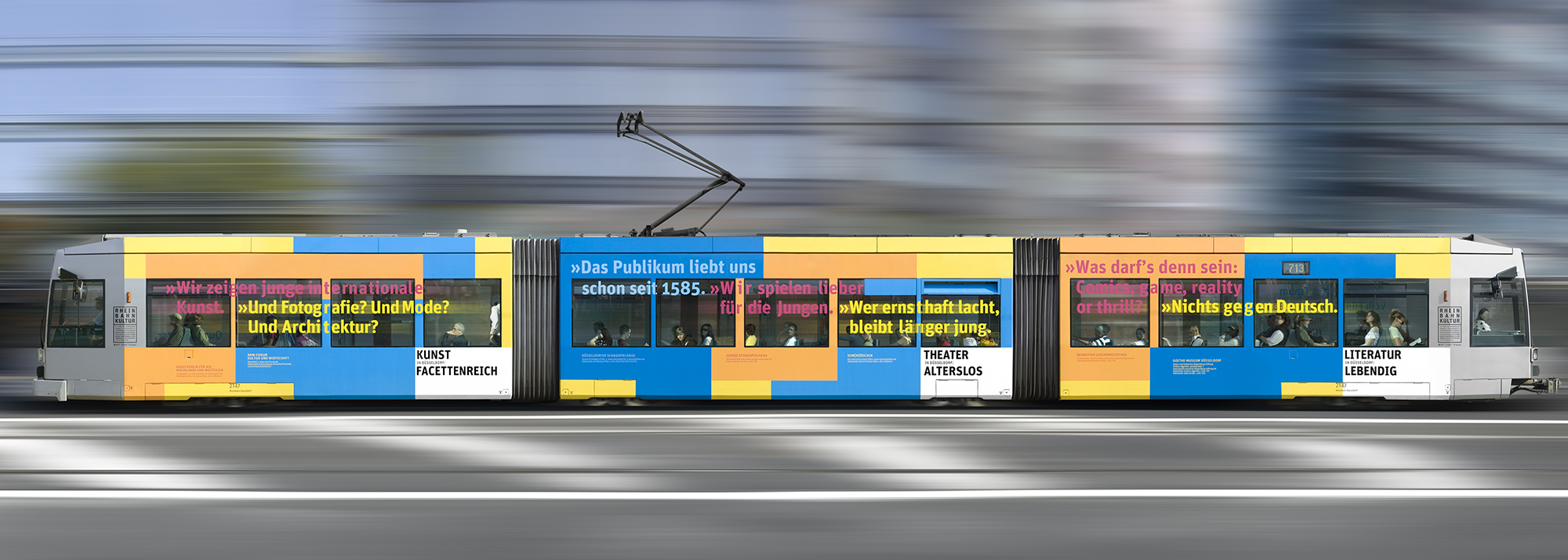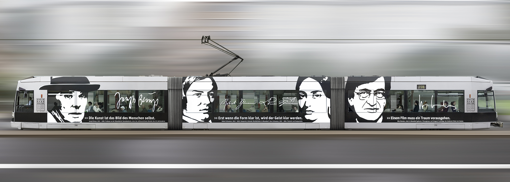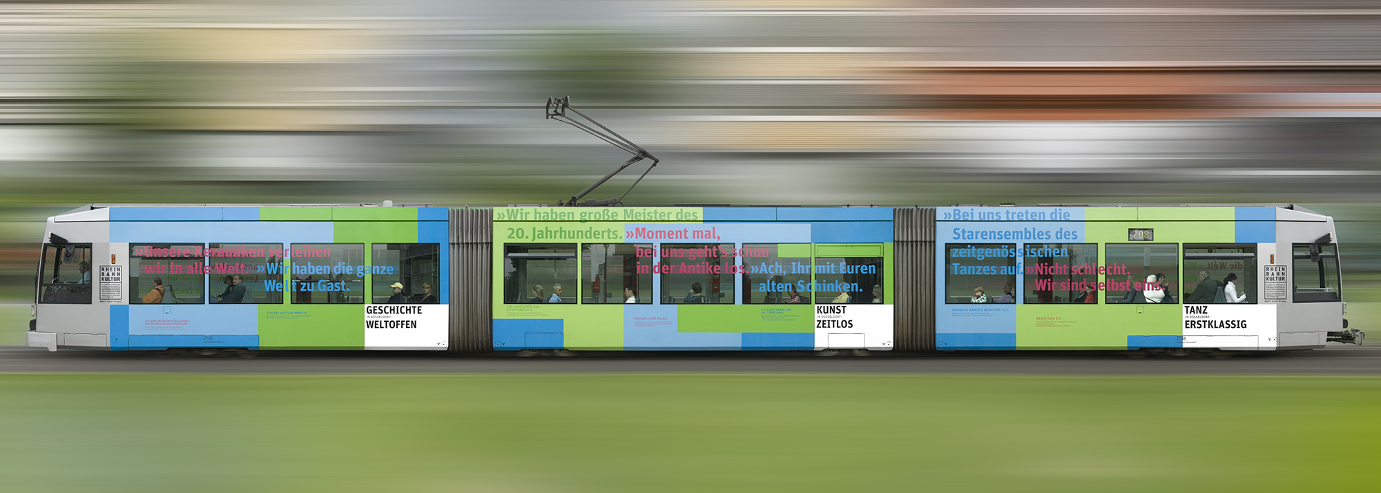 Und weil die Phantasie der Studierenden so vielfältig ist wie das städtische Portfolio, geht nicht nur ein Sieger aus dem Wettbewerb hervor. Insgesamt werden vier verschiedene Werbelinien realisiert, die unter dem Label RHEIN BAHN KULTUR gemeinsam Reklame fahren.