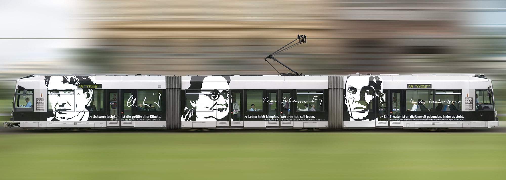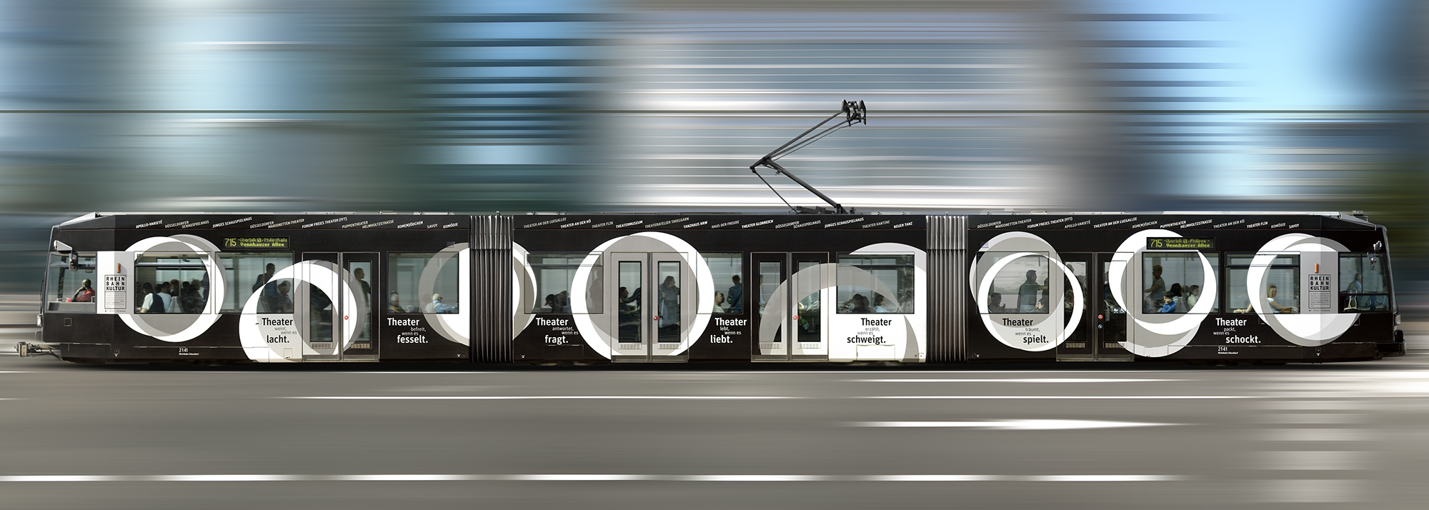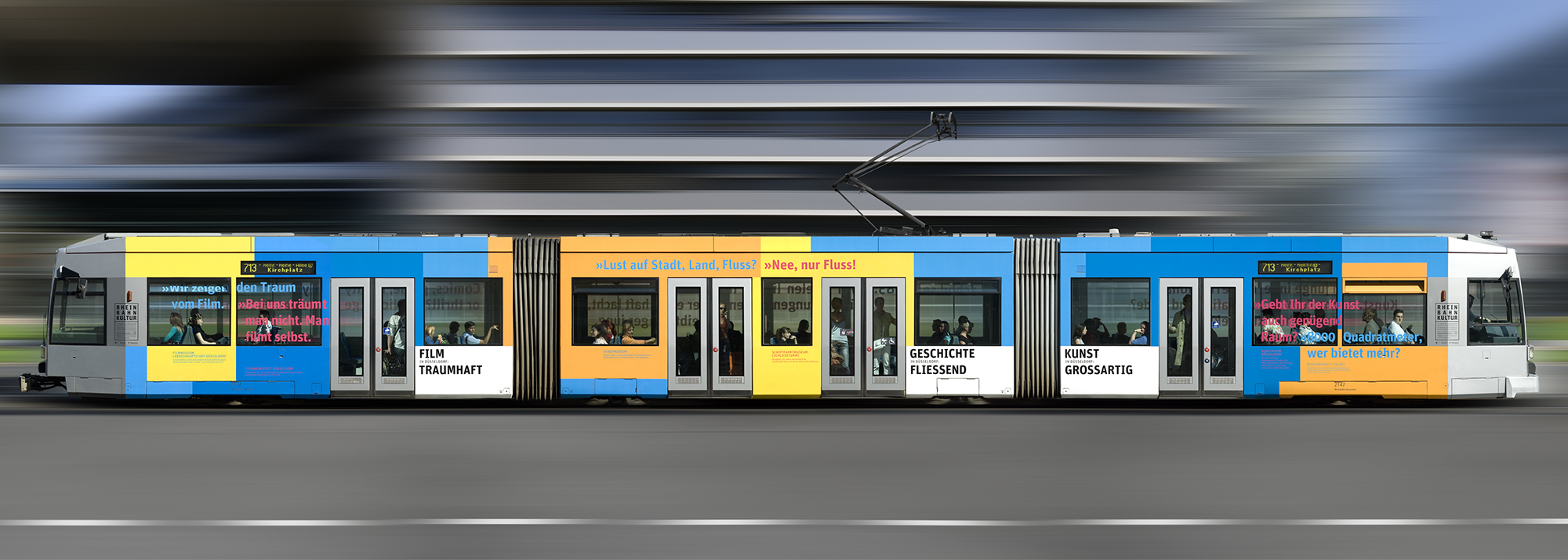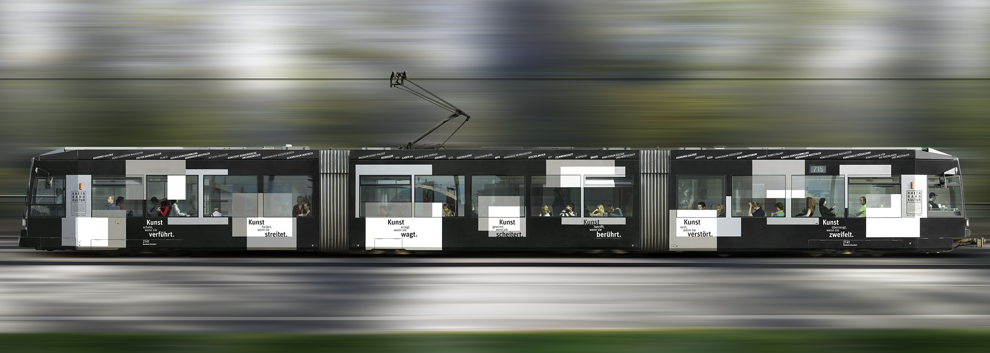 Und weil die Phantasie der Studierenden so vielfältig ist wie das städtische Portfolio, geht nicht nur ein Sieger aus dem Wettbewerb hervor. Insgesamt werden vier verschiedene Werbelinien realisiert, die unter dem Label RHEIN BAHN KULTUR gemeinsam Reklame fahren.