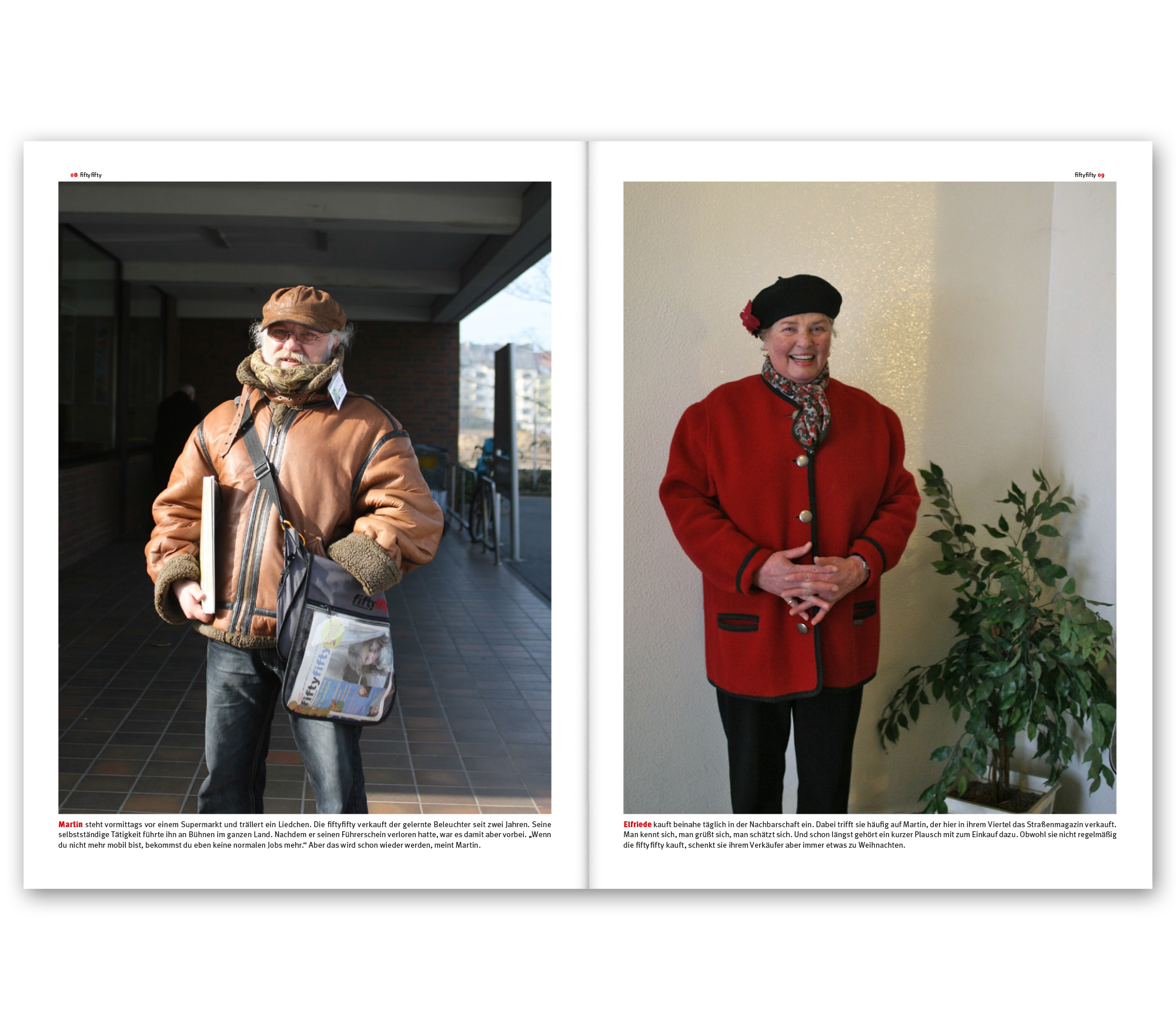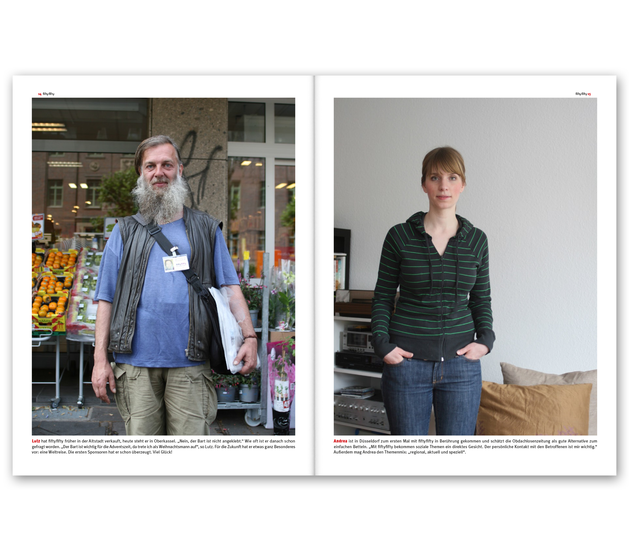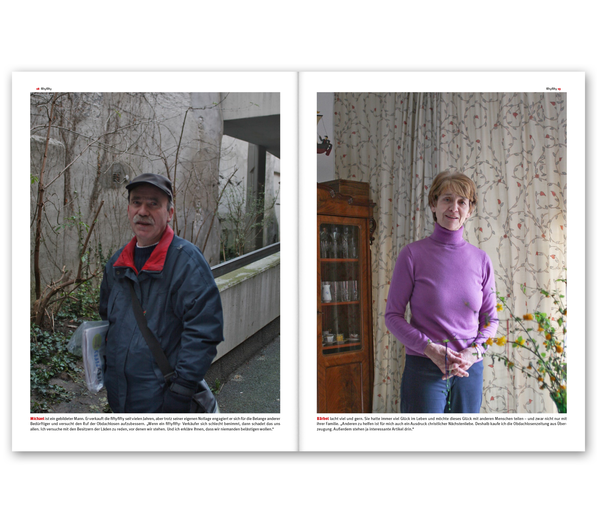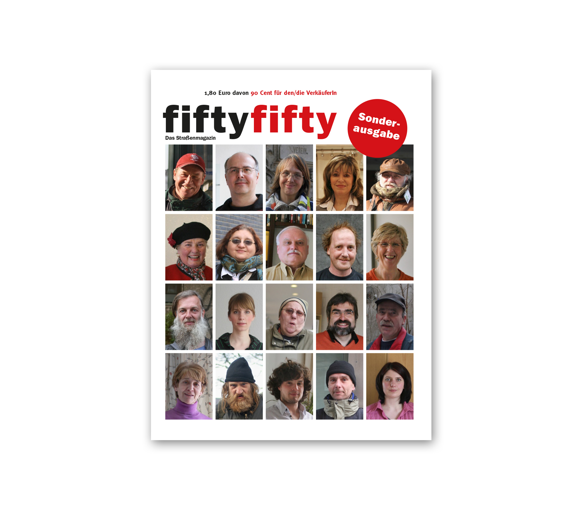 Das Titelblatt des Motivs stammt nicht von einem beliebigen Heft. Es zeigt die Porträts vieler Menschen. Blättert man dieses Magazin auf, erblickt man auf jeder Doppelseite zwei Porträts. Einen Verkäufer oder eine Verkäuferin, draußen auf der Straße. Und daneben einen Käufer oder eine Käuferin, daheim in der eigenen Wohnung. Und jedes Paar sagt ein paar Sätze aus dem täglichen Leben. Und darüber, was die beiden Personen verbindet: fiftyfifty.