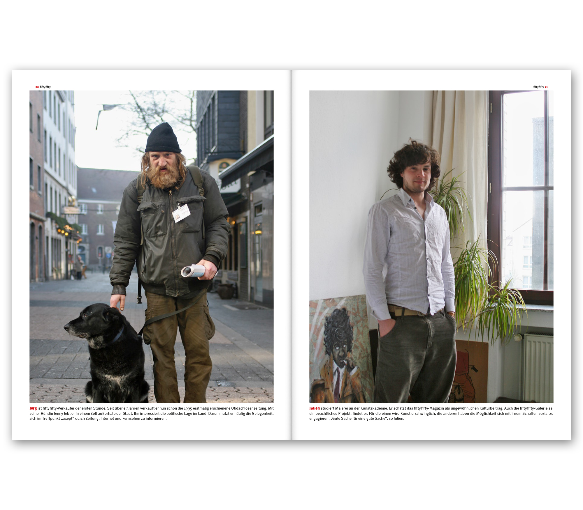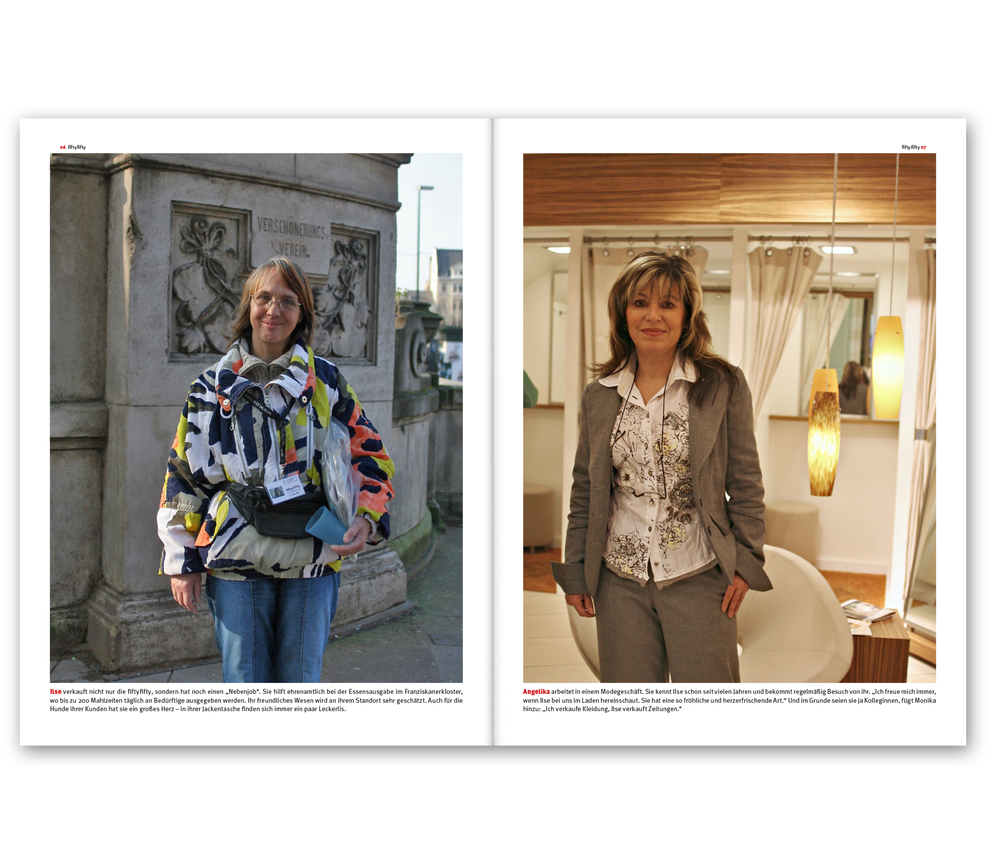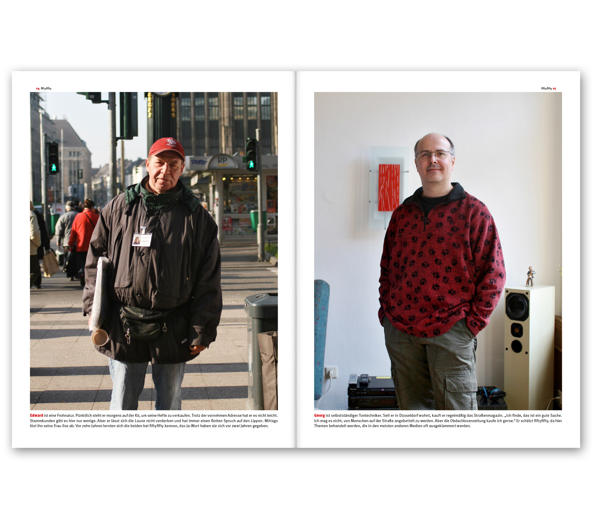 Das Titelblatt des Motivs stammt nicht von einem beliebigen Heft. Es zeigt die Porträts vieler Menschen. Blättert man dieses Magazin auf, erblickt man auf jeder Doppelseite zwei Porträts. Einen Verkäufer oder eine Verkäuferin, draußen auf der Straße. Und daneben einen Käufer oder eine Käuferin, daheim in der eigenen Wohnung. Und jedes Paar sagt ein paar Sätze aus dem täglichen Leben. Und darüber, was die beiden Personen verbindet: fiftyfifty.