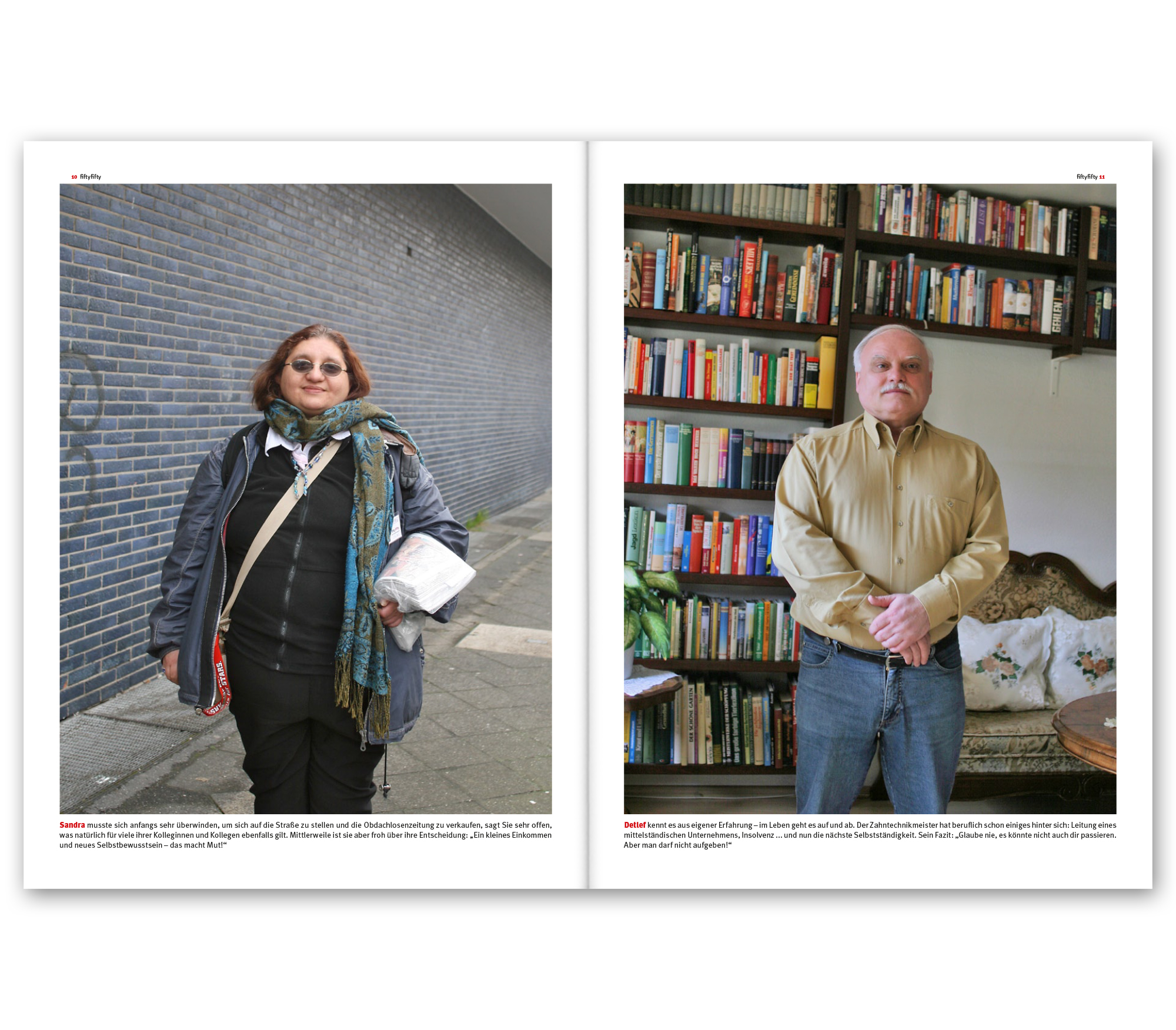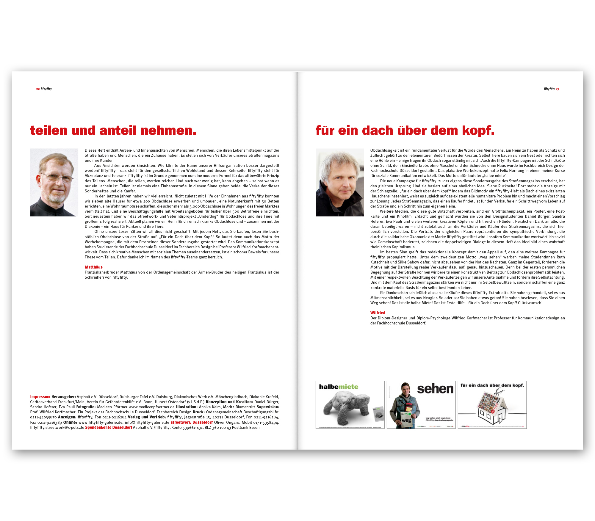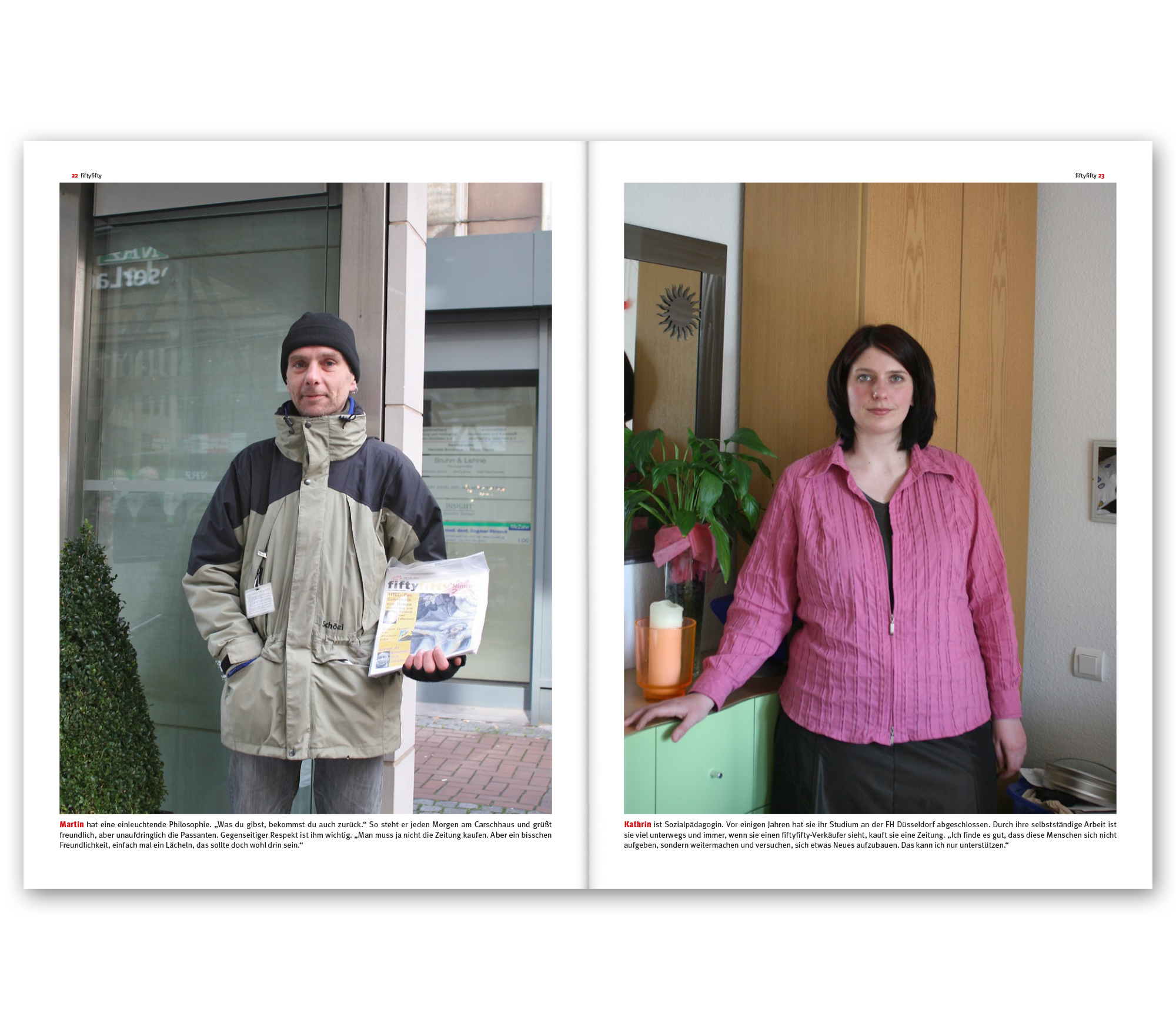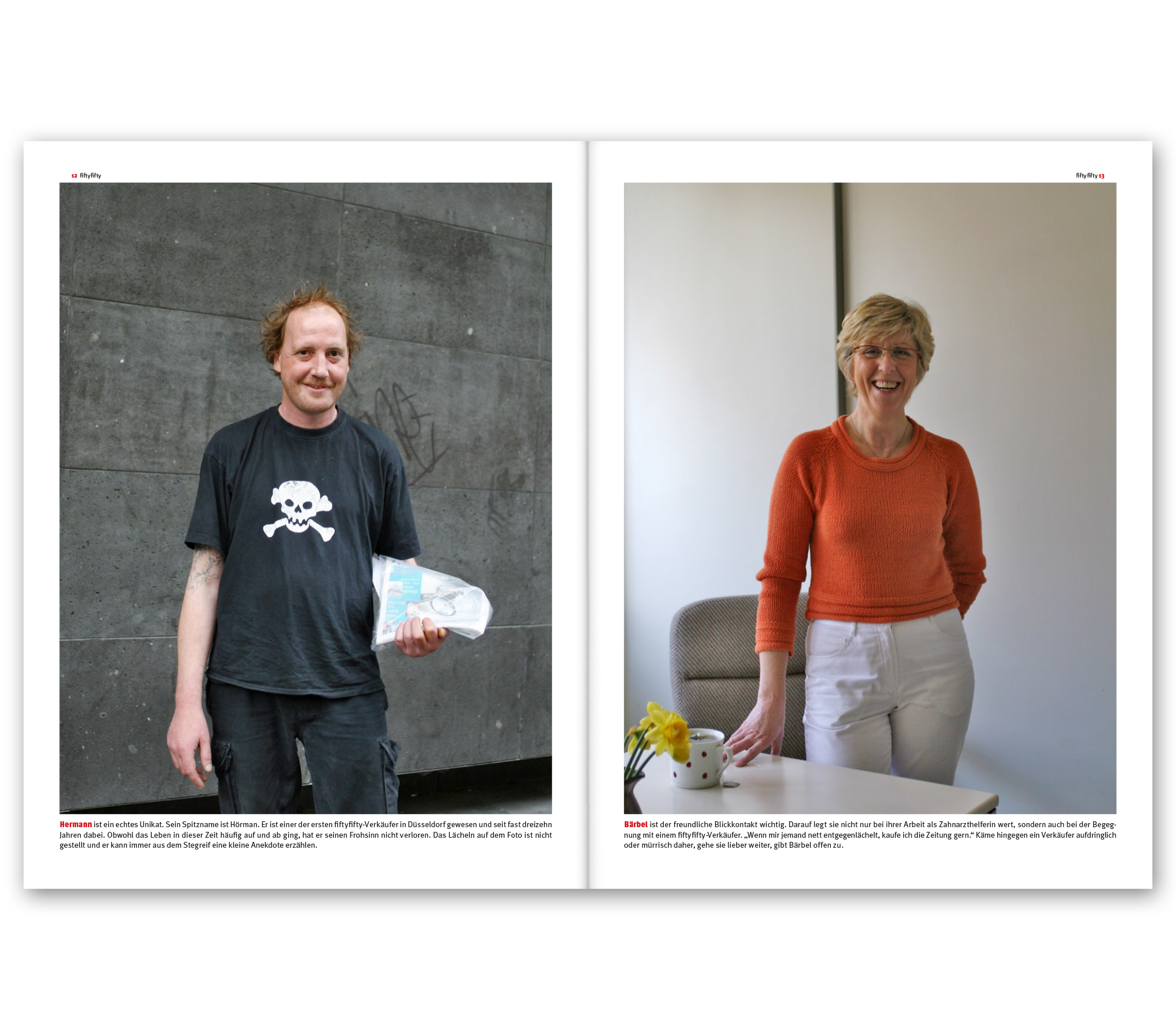Das Titelblatt des Motivs stammt nicht von einem beliebigen Heft. Es zeigt die Porträts vieler Menschen. Blättert man dieses Magazin auf, erblickt man auf jeder Doppelseite zwei Porträts. Einen Verkäufer oder eine Verkäuferin, draußen auf der Straße. Und daneben einen Käufer oder eine Käuferin, daheim in der eigenen Wohnung. Und jedes Paar sagt ein paar Sätze aus dem täglichen Leben. Und darüber, was die beiden Personen verbindet: fiftyfifty.