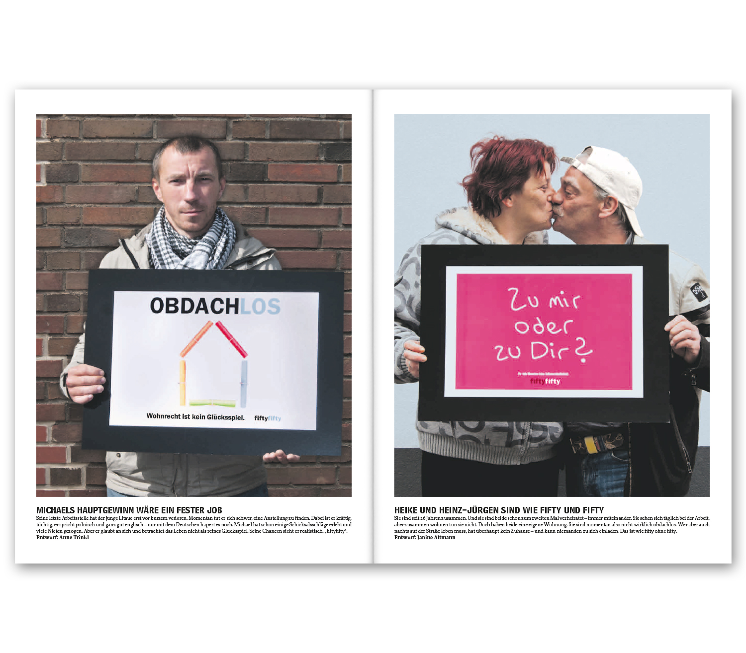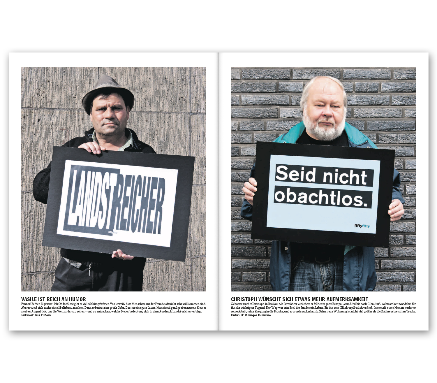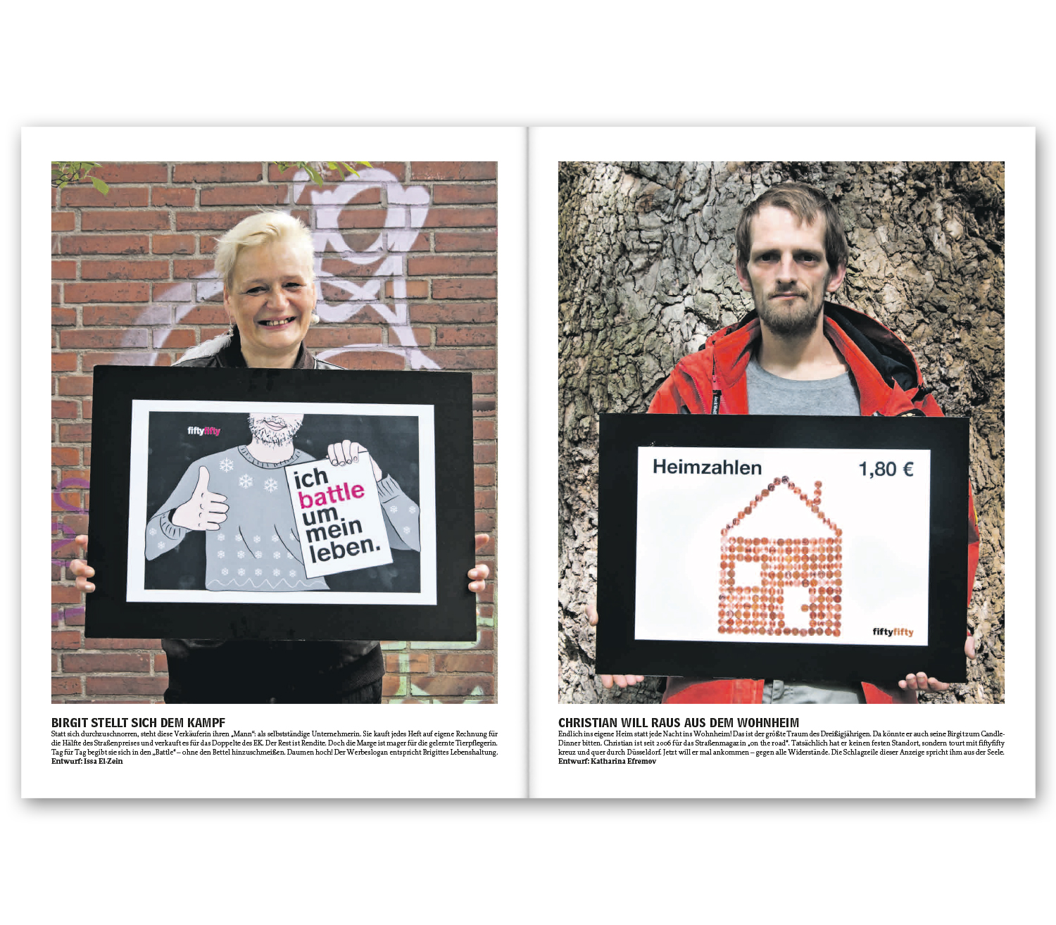 Und so erklären sich auch alle Teilnehmer bereit, die Kampagne präsentieren. Und ihre Porträts in einer Beilage der fiftyfifty veröffentlichen zu lassen.