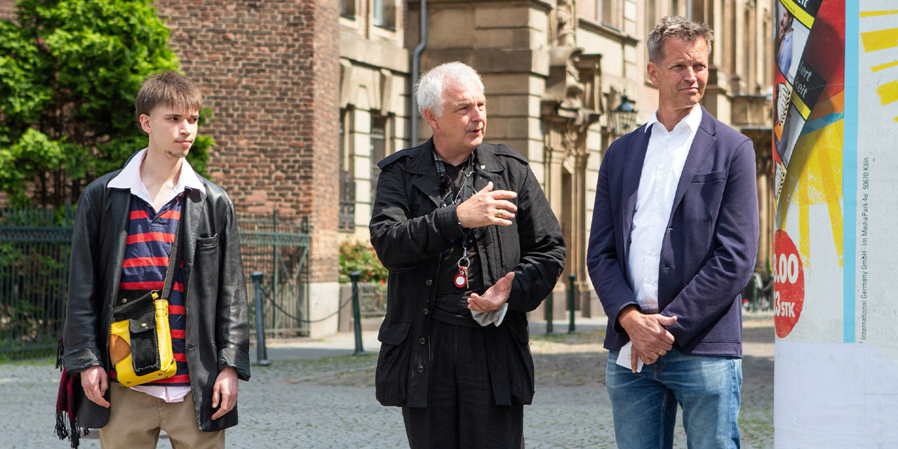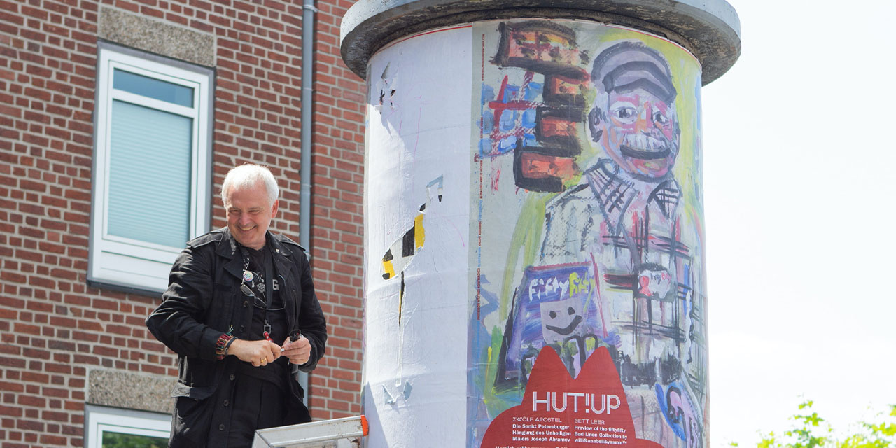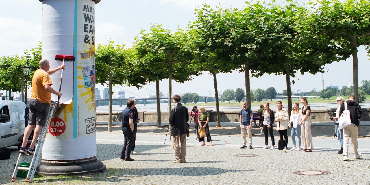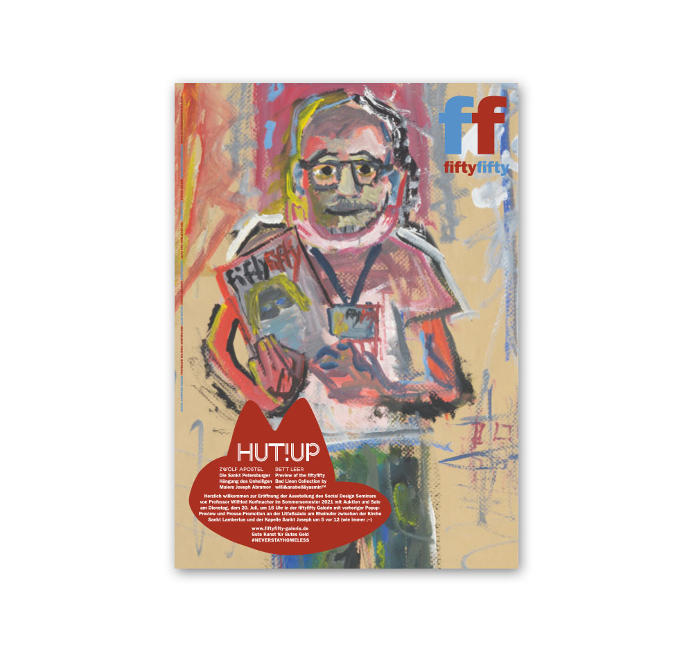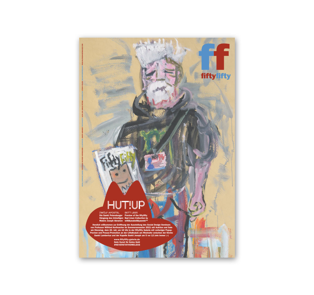 Fünf vor zwölf. Wie immer. Zur höchsten Zeit versammeln sich Presse und Promis mitten in der Altstadt an Ort und Stelle. Und alle sind sie von der Rolle. Das Projekt in der Pandemie: Joseph Abramov präsentiert Plakate mit Porträts von fiftyfifty Verkäuferinnen und Verkäufern. Ab sofort werben die Poster an Litfaßsäulen in ganz Düsseldorf für soziale Aktionen aller Art im Kampf gegen die Obdachlosigkeit. Bürgermeister Josef Hinkel führt als Schirmherr zum Rathaus.
