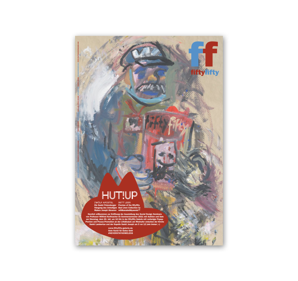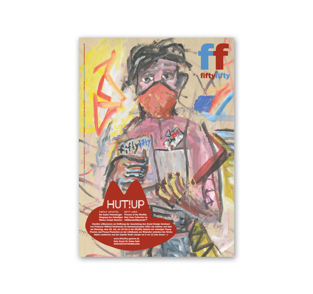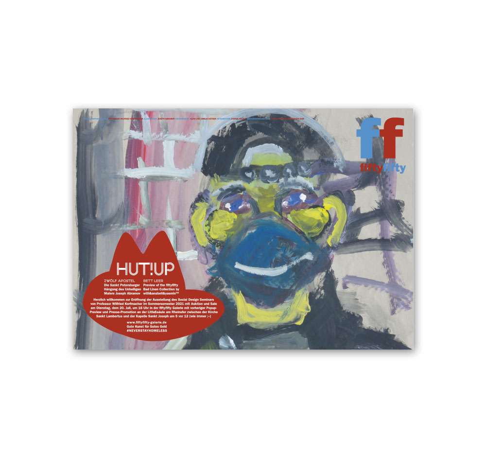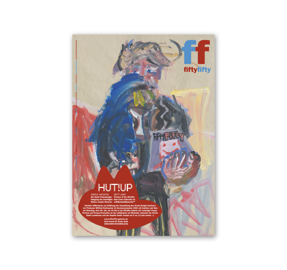 Nach der sozialen Aktion zum „Happy Beuys Day" ziehen wir den Hut vor jenen, die ihr Leben auf der Straße fristen. Und mit der Anspielung auf die Hütten, in denen sie hausen könnten, steht die fiftyfifty Forderung für das Recht auf Wohnen im öffentlichen Raum: „Housing first".