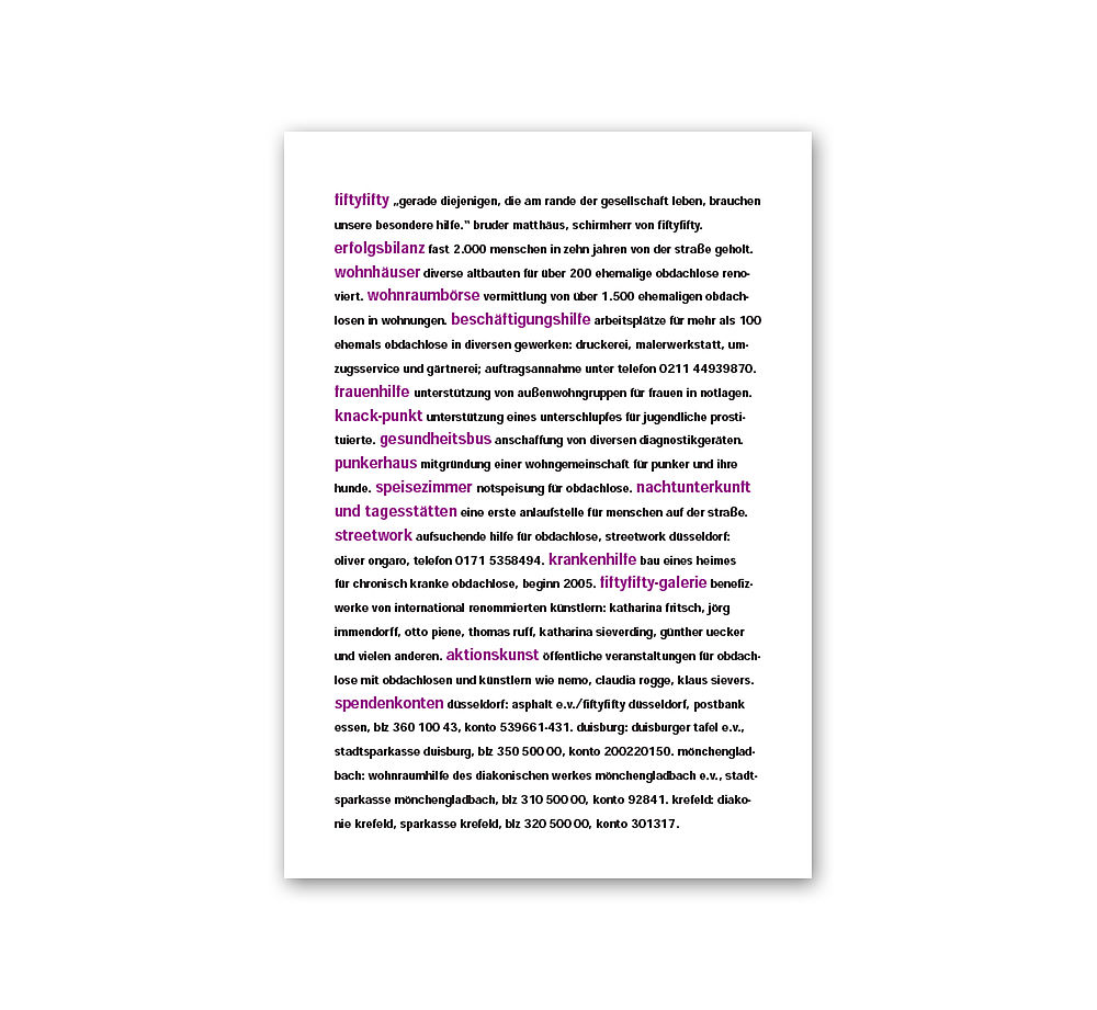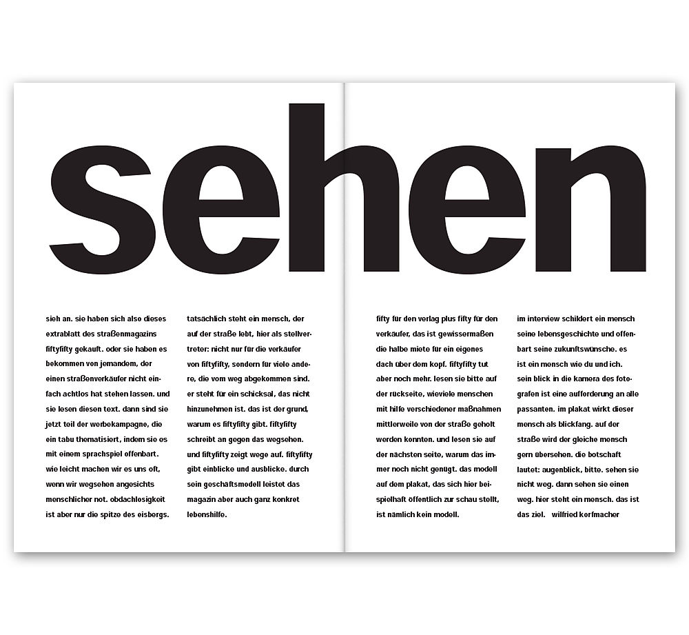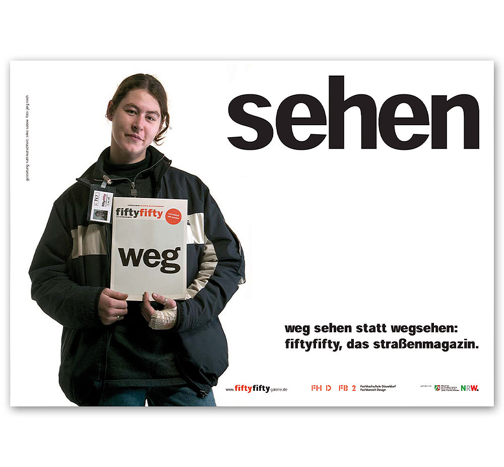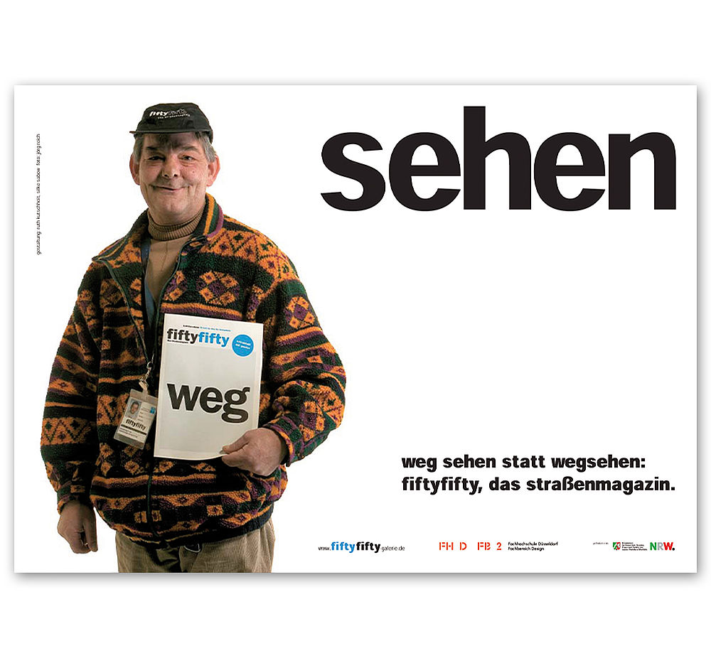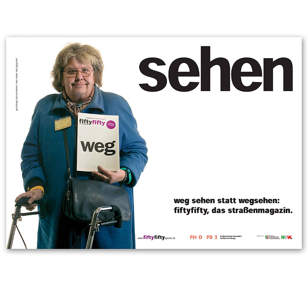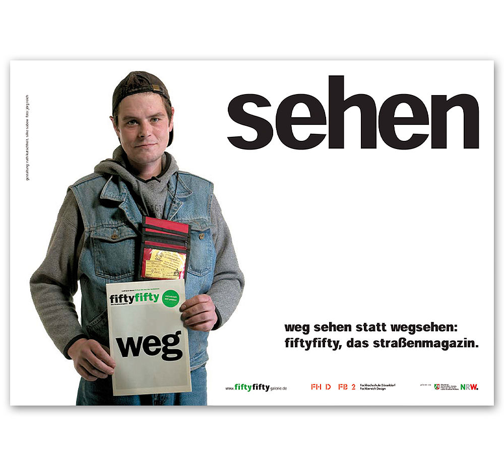 Armut wird gern übersehen. Dagegen stellt sich fiftyfifty: mit dem Magazin, das die obdachlosen Verkäuferinnen und Verkäufer auf der Straße feilbieten. Das Geschäftsmodell ist die Idee dieser Kampagne: Weg sehen statt wegsehen.